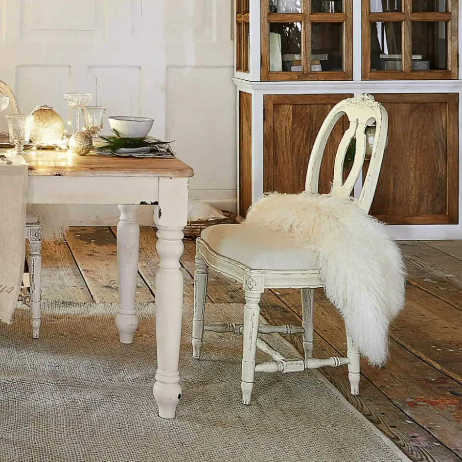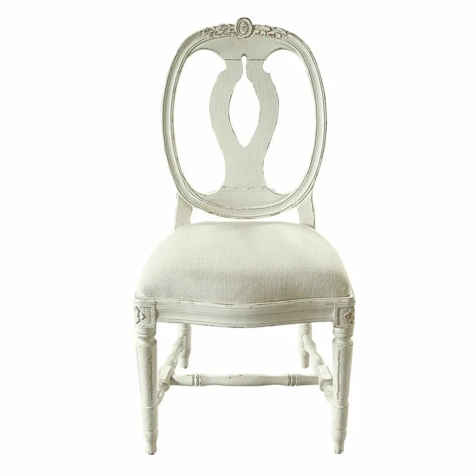 Tauchen Sie ein in die nostalgische Welt des Shabby Chic mit unserem handgefertigten Stuhl. Das Gestell aus Eichenholz mit Antik-Finish verleiht ihm einen charmanten Vintage-Look. Der Sitz ist gepolstert und mit einem Bezugsstoff aus Leinen, Viskose und Baumwolle versehen, der nicht nur fest und strapazierfähig ist, sondern auch eine natürliche Ästhetik ausstrahlt. Die Beine und die Rückenlehne des Stuhls sind als Highlight mit kunstvollen Ornamenten verziert, die ihm einen besonderen Reiz verleihen. Dieser Stuhl ist nicht nur ein funktionales Möbelstück, sondern auch ein Kunstwerk, das Ihrem Raum eine einzigartige Note verleiht.