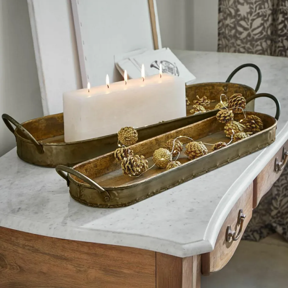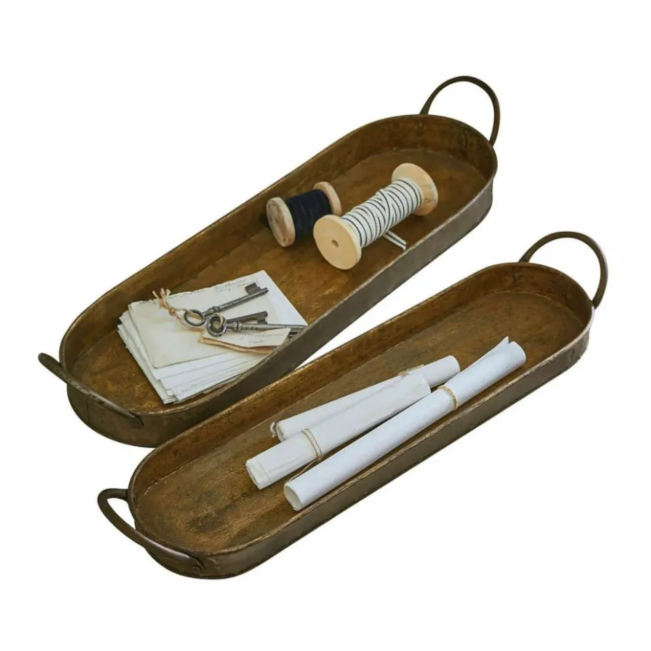 Ob als Bühne für Kerzen, Gläser oder saisonale Highlights – dieses Tablett-Set sorgt für eindrucksvolle Auftritte. Die besondere Länge verleiht den beiden Stücken eine fast skulpturale Wirkung, während die antikgoldene Oberfläche durch ihren dezenten Glanz wie ein gelebter Schatz wirkt. Die bewusst unregelmäßige Struktur des Metalls bringt Lebendigkeit ins Spiel und macht jedes Tablett zu einem Blickfang. Abgerundet wird das Design durch die dunklen Griffe aus Eisen, die nicht nur stabil sind, sondern auch den rauen Charme vergangener Zeiten unterstreichen. Ob auf dem Esstisch, Sideboard oder Fensterbrett – diese Tabletts erzählen Geschichten von Stil und Charakter.