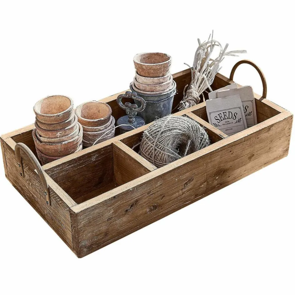 Mit diesem einzigartigen Tablett holen Sie sich ein Stück rustikaler Gemütlichkeit in Ihr Zuhause. Aus wiederaufbereitetem Holz gefertigt, strahlt es eine natürliche Wärme und Authentizität aus, die in keiner modernen Einrichtung fehlen darf. Der charmante „Farmers Market“-Aufdruck und die griffigen Metallgriffe unterstreichen den nostalgischen Charakter und machen es zu einem echten Hingucker. Ob als Ordnungshelfer in der Küche, für Utensilien auf dem Esstisch oder als dekorativer Akzent – dieses Tablett vereint Praktikabilität und ansprechendes Design. Die Fächeraufteilung bietet eine clevere Möglichkeit, kleine Gegenstände stilvoll zu sortieren und jederzeit griffbereit zu haben.