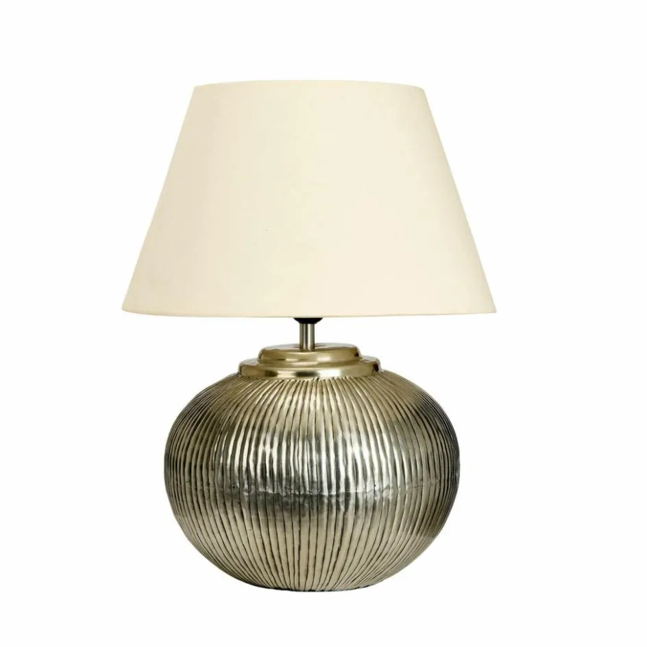 Wie ein Lichtobjekt aus einer anderen Zeit steht diese Tischlampe mit ihrem antiksilbernen Fuß im Mittelpunkt jeder Einrichtung. Die unregelmäßigen Rillen mit zusätzlich gehämmerter Oberfläche verleihen der Oberfläche eine lebendige Struktur und einen Hauch Nostalgie – als hätte sie schon viele Geschichten erlebt. Der Baumwollschirm in hellem Naturton bringt optische Ruhe und sorgt für ein sanftes, blendfreies Licht. Auf dem Beistelltisch oder der Kommode setzt sie ein warmes Statement – zurückhaltend im Ausdruck, aber eindrucksvoll in der Wirkung.