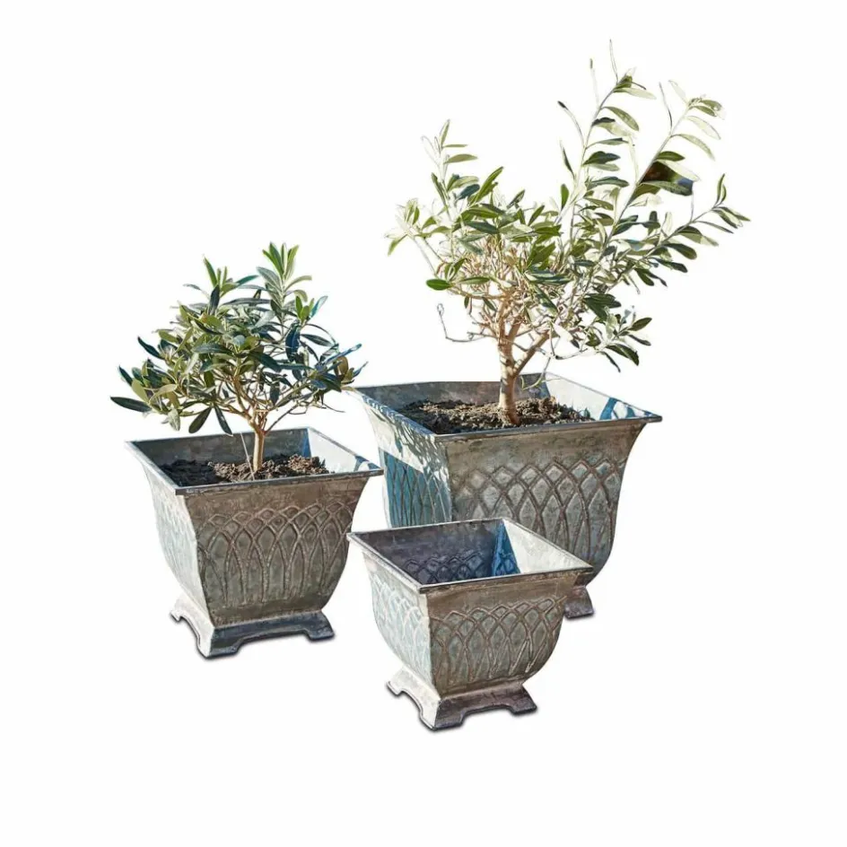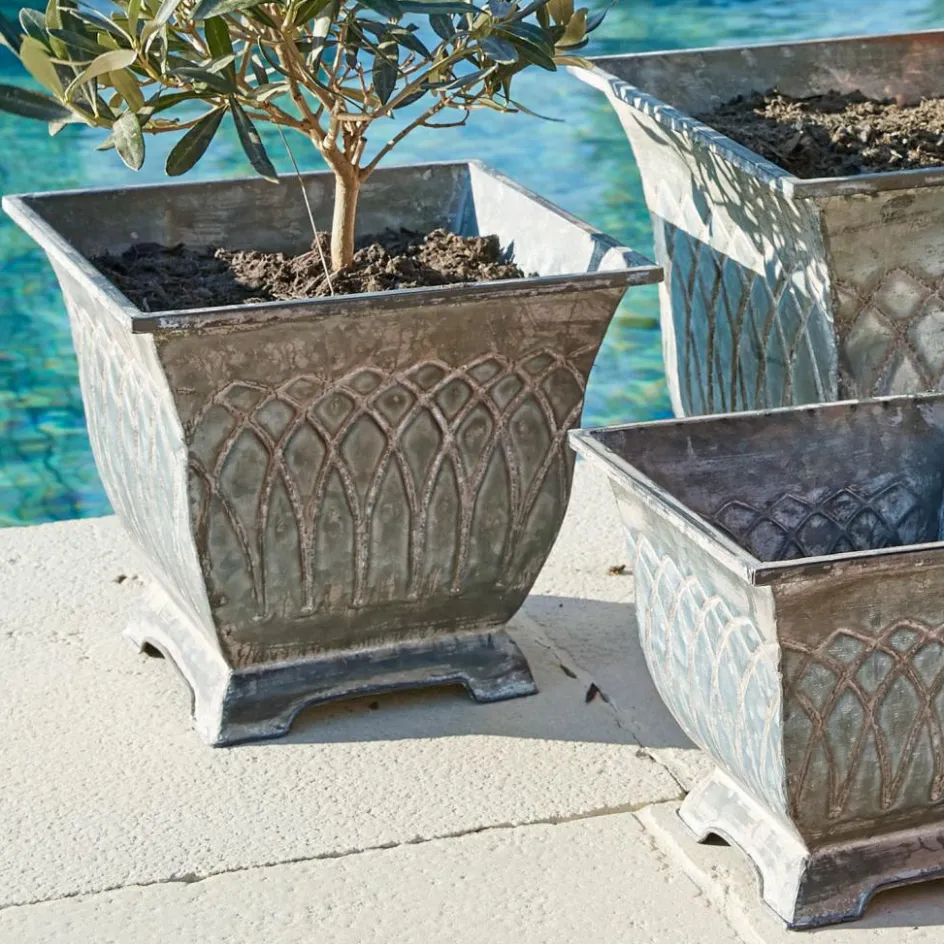 Dekorieren Sie den Innen- oder Außenbereich Ihres Zuhauses mit diesem dreiteiligen Set, um französisches Vintage-Flair mit rustikalem Touch zu erzeugen. Das authentische Antik-Design lässt Ihre Pflanzen erstrahlen, sorgt für Eleganz und Anmut. Um einfach nur etwas frischen Wind in die Einrichtung zu bringen, sind sie ebenfalls die richtige Wahl. Die eckige Form und kunstreichen Verzierungen heben den Look wohltuend von der Masse ab. Die Übertöpfe sind aus Eisen gefertigt und damit nicht nur leichter, sondern auch robuster als Übertöpfe aus Steingut. Sie müssen also nicht mit Samthandschuhen angefasst werden. Haustiere und herumtollende Kinder können diesen Schmuckstücken nichts anhaben.