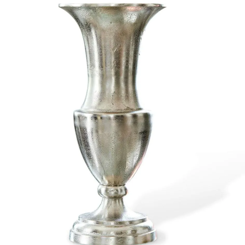 Anmutig und prächtig – fast wie ein Siegerpokal. Die Vase wurde im Aluminiumgussverfahren hergestellt und antiksilber veredelt. Auffällig schön sind auch die anmutige Form und das schlanke Design. Darum wirkt das edle Stück trotz 44 Zentimetern Höhe nicht zu mächtig. Blumensträuße oder Solitärgewächse wirken darin gleich doppelt so hübsch, aber auch ohne „Füllung“ macht die Vase eine gute Figur.