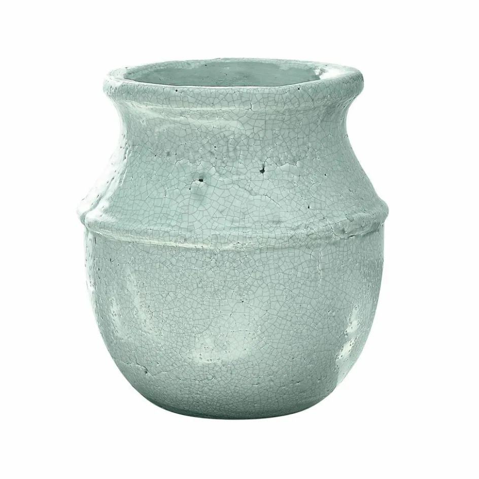 Mit ihrer harmonischen Silhouette und dem ausdrucksstarken Krakelee-Finish ist diese Vase mehr als nur ein funktionales Accessoire. Das Terrakotta-Material mit seiner dezenten Struktur wird durch einen sanften Blauton ergänzt, der Ruhe und Gelassenheit ausstrahlt. Der subtile Glanz und die unregelmäßigen Risse im Finish erzählen von einer besonderen Ästhetik, die jedes Stück zu einem Unikat macht. Ideal, um zarte Blumenarrangements in Szene zu setzen oder einfach als alleinstehenden Akzent auf einem Tisch oder Sideboard.