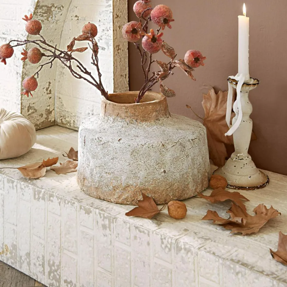 Ein Stück voller Geschichte und natürlicher Schönheit! Diese imposante Vase aus Terrakotta verbindet raue Ursprünglichkeit mit kunstvoller Patina. Das matte White-Washed-Finish hebt die organische Textur hervor und unterstreicht ihren rustikalen Charakter. Während die glasierte Innenseite für eine feine optische Balance sorgt, bleibt die Vase ausschließlich für Trockenblumen oder dekorative Zweige geeignet. Ein markantes Design-Statement, das Natürlichkeit und Handwerkskunst in Einklang bringt.