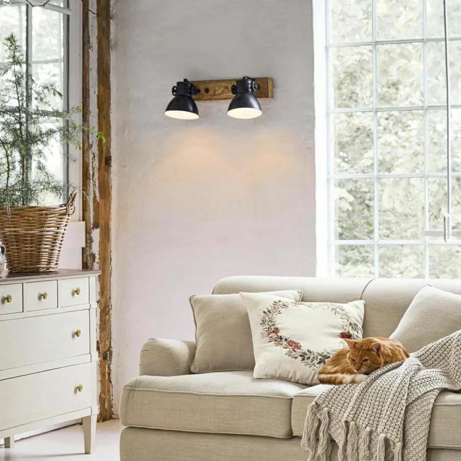 In Zeiten der Industrialisierung war sie in Fabrikhallen ein praktischer Lichtspender. Auch heute noch begeistert diese Wandlampe mit den Reizen der frühen Moderne und bringt stilvoll Licht in Ihr Zuhause. Sie ist gemäß dem Look französischer Vorbilder aus Metall gefertigt – außen schwarz, innen weiß – so strahlt das Licht angenehm hell. Beide Schirme lassen sich durch charakteristische Justier-Rädchen nach Belieben schwenken, so dass sie ihren Wirkungskreis perfekt ausleuchten. Einen schönen Kontrast zum kühlen Metall setzt die Halterung aus massivem Mangoholz, welche auf der Rückseite die Kabel elegant verschwinden lässt. In eine Einrichtung im Industrial-Style passt der Wandstrahler perfekt – ob in der Küche, in der Diele, im Badezimmer oder über dem Schreibtisch.
