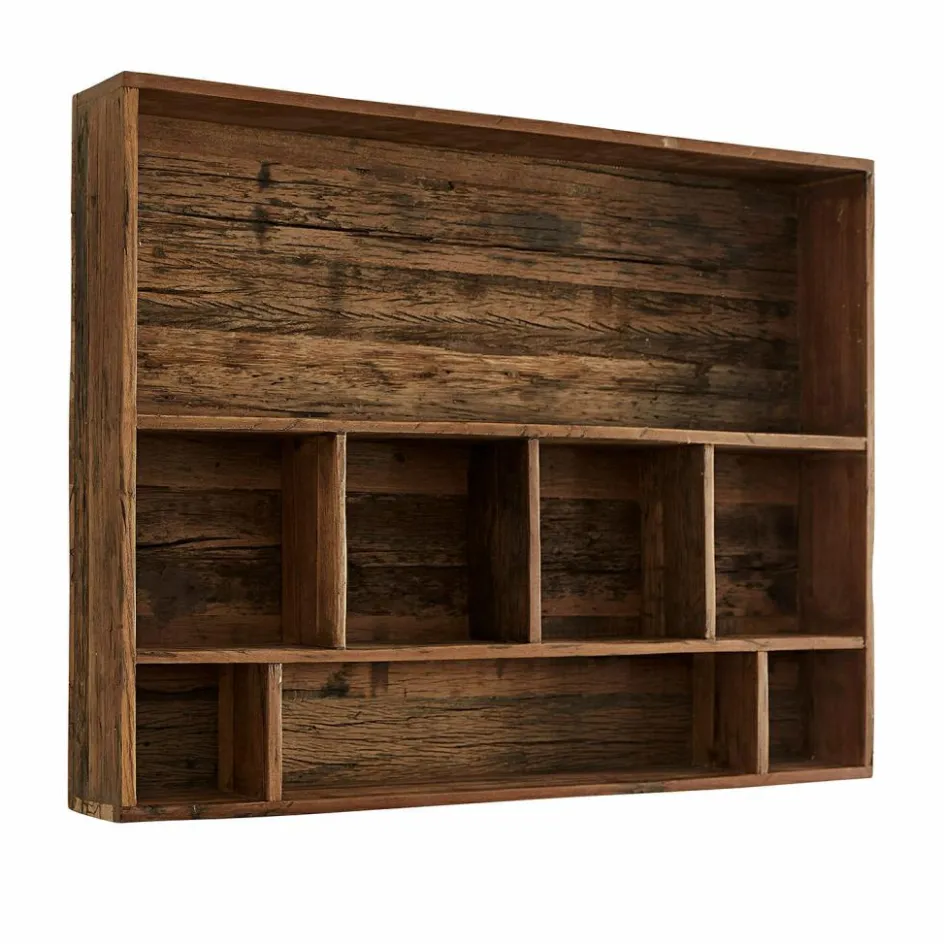 Das Wandregal, gefertigt aus wiederaufbereitetem Salbaumholz, bringt den Charme der Natur direkt in Ihr Zuhause. Seine charakteristische Maserung und warme Farbgebung verleihen dem Möbelstück eine einzigartige rustikale Note. Die praktische Einteilung in verschiedene Fächer bietet reichlich Stauraum und macht es zu einem vielseitigen Element in jeder Einrichtung. Egal, ob Sie es zur Präsentation von Büchern und Deko im Wohnzimmer, für Gewürze und Küchenutensilien in der Küche oder zur Organisation von Dokumenten im Arbeitszimmer verwenden, dieses Regal fügt sich harmonisch in verschiedene Wohnstile ein und setzt warme Akzente.