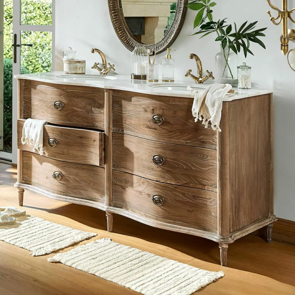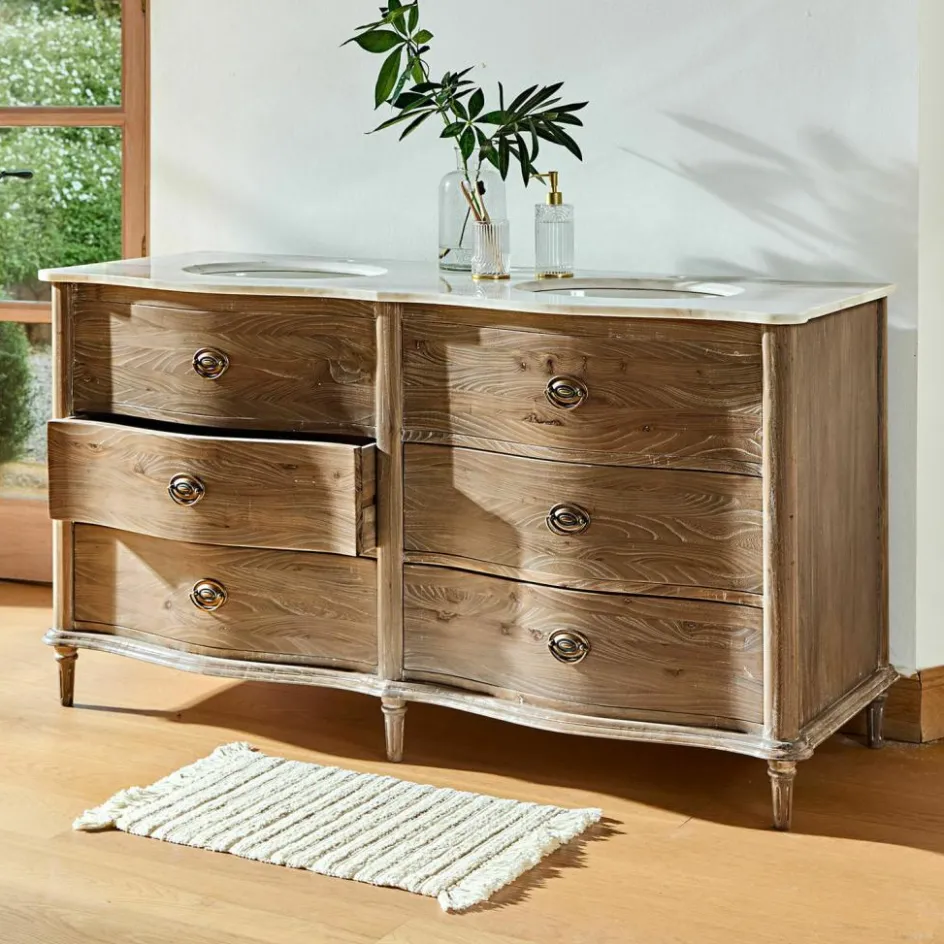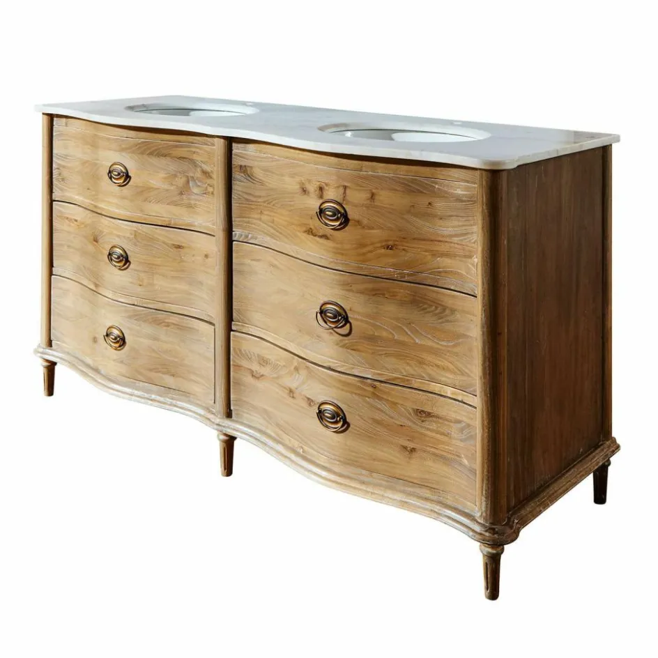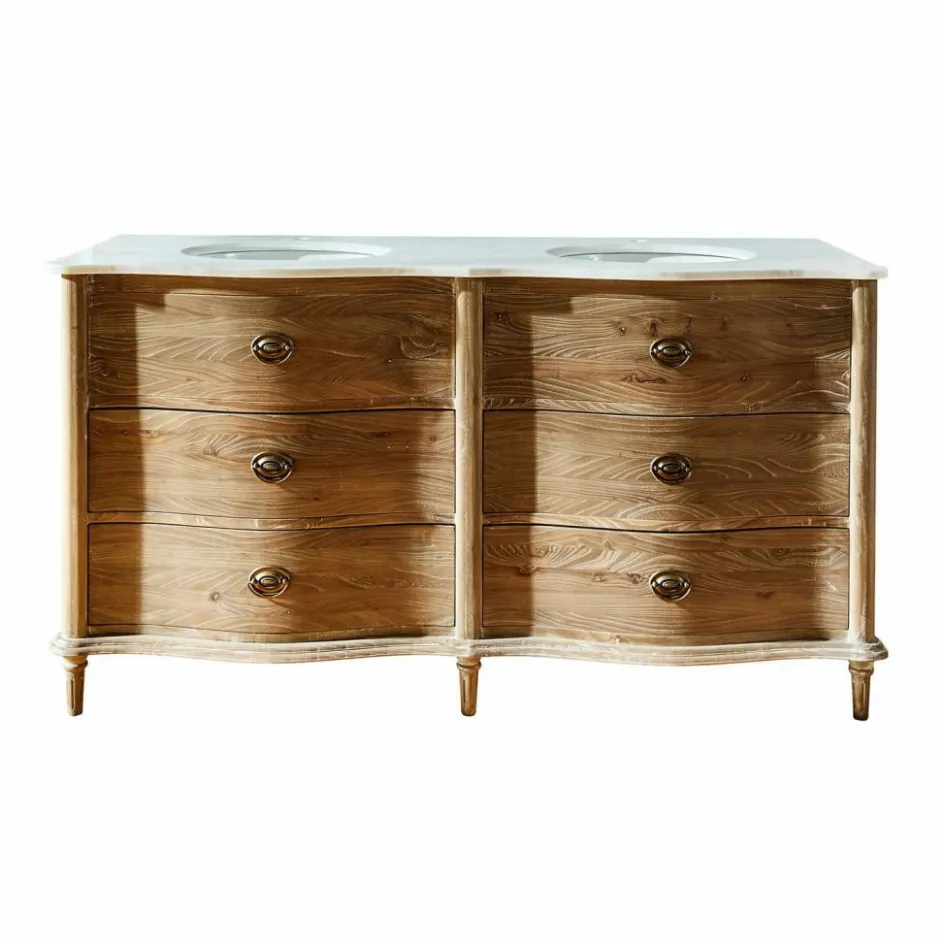 Ein Meisterwerk, das Funktion und Ästhetik in Perfektion vereint. Der großzügige Doppelwaschtisch überzeugt durch seine hochwertige Verarbeitung und das stimmungsvolle Zusammenspiel von Naturmaterialien. Der geschwungene Korpus aus massivem Ulmenholz zeigt eine einzigartige Maserung, die durch die dezente White-Washed-Veredelung subtil hervorgehoben wird. Die edle Marmorplatte mit weichen Rundungen folgt dem Verlauf des Korpus und bietet Platz für zwei eingelassene Keramikbecken, die das tägliche Ritual zu einem luxuriösen Erlebnis machen. Die unteren vier Schubladen, ausgestattet mit nostalgischen Metallgriffen, bieten großzügigen Stauraum, während die oberen beiden Schubladen das harmonische Design abrunden. Ein Möbelstück, das für Stilbewusstsein und praktische Eleganz steht.
