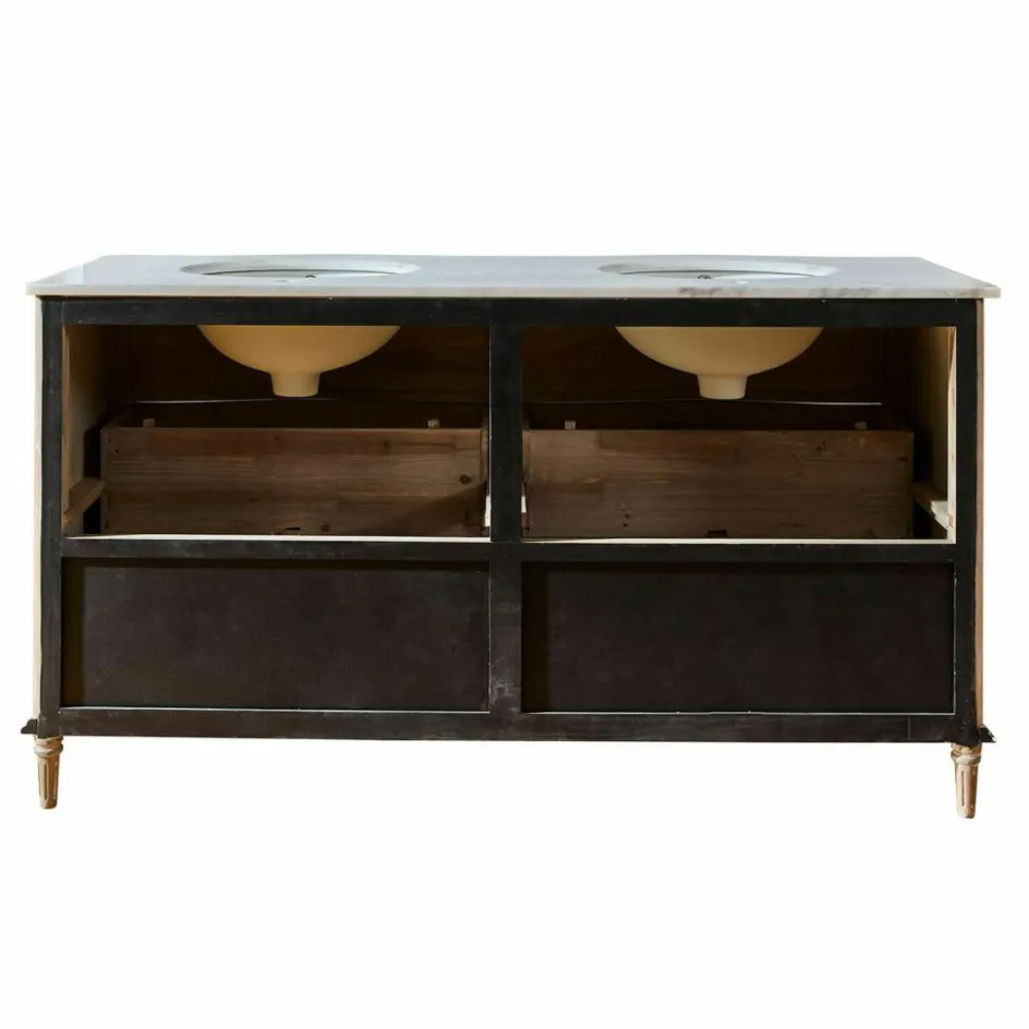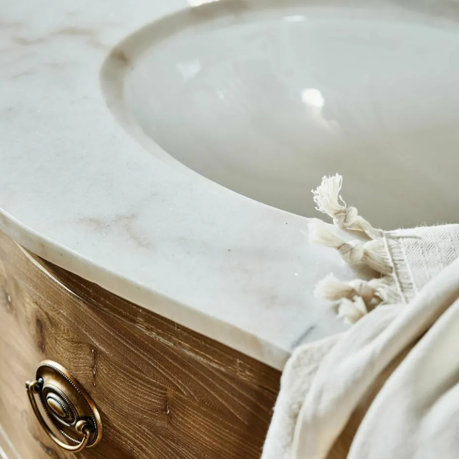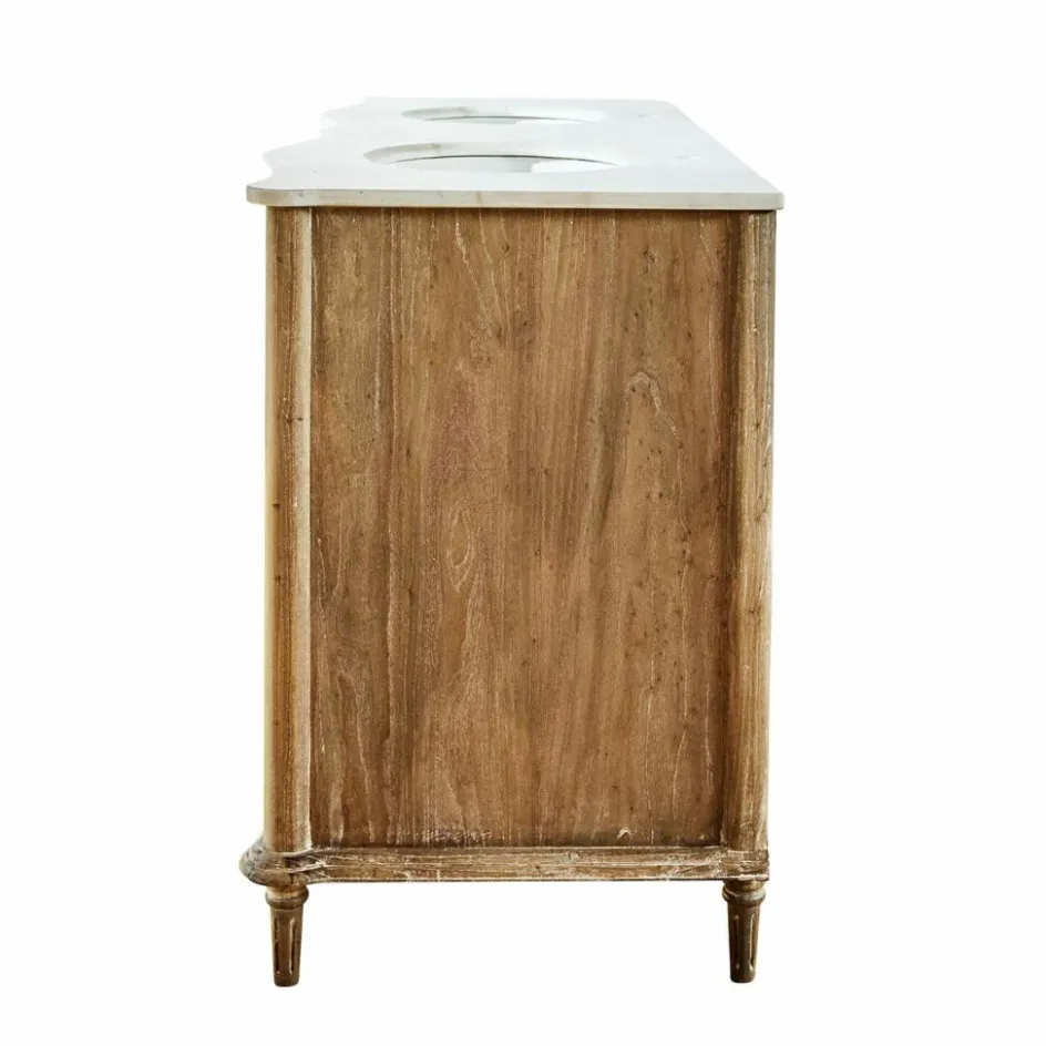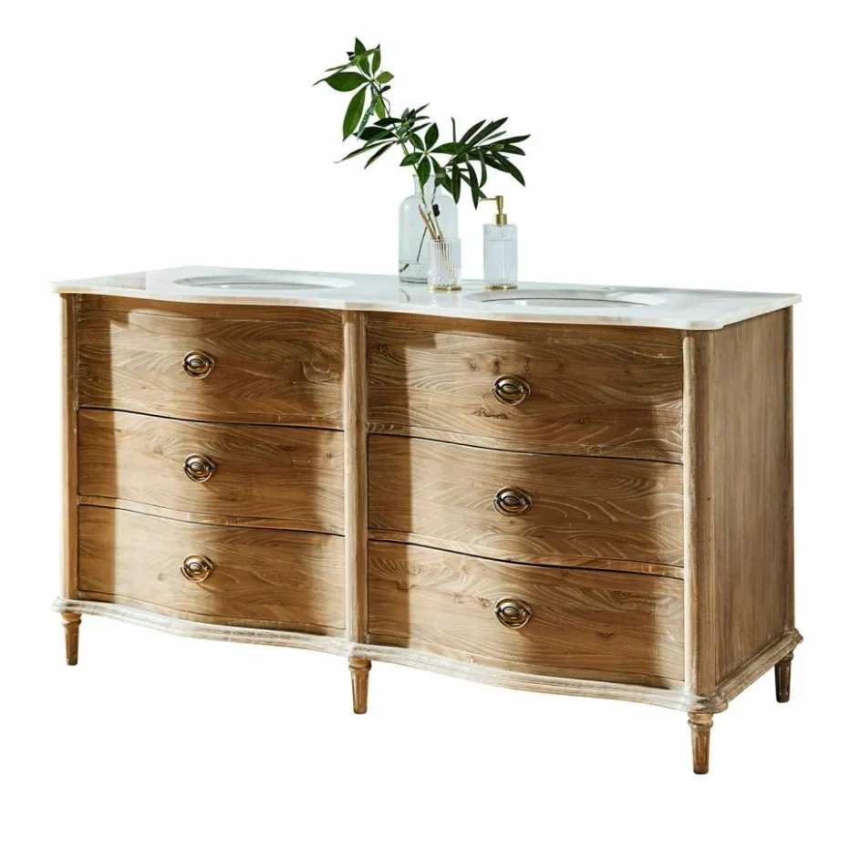 Ein Meisterwerk, das Funktion und Ästhetik in Perfektion vereint. Der großzügige Doppelwaschtisch überzeugt durch seine hochwertige Verarbeitung und das stimmungsvolle Zusammenspiel von Naturmaterialien. Der geschwungene Korpus aus massivem Ulmenholz zeigt eine einzigartige Maserung, die durch die dezente White-Washed-Veredelung subtil hervorgehoben wird. Die edle Marmorplatte mit weichen Rundungen folgt dem Verlauf des Korpus und bietet Platz für zwei eingelassene Keramikbecken, die das tägliche Ritual zu einem luxuriösen Erlebnis machen. Die unteren vier Schubladen, ausgestattet mit nostalgischen Metallgriffen, bieten großzügigen Stauraum, während die oberen beiden Schubladen das harmonische Design abrunden. Ein Möbelstück, das für Stilbewusstsein und praktische Eleganz steht.