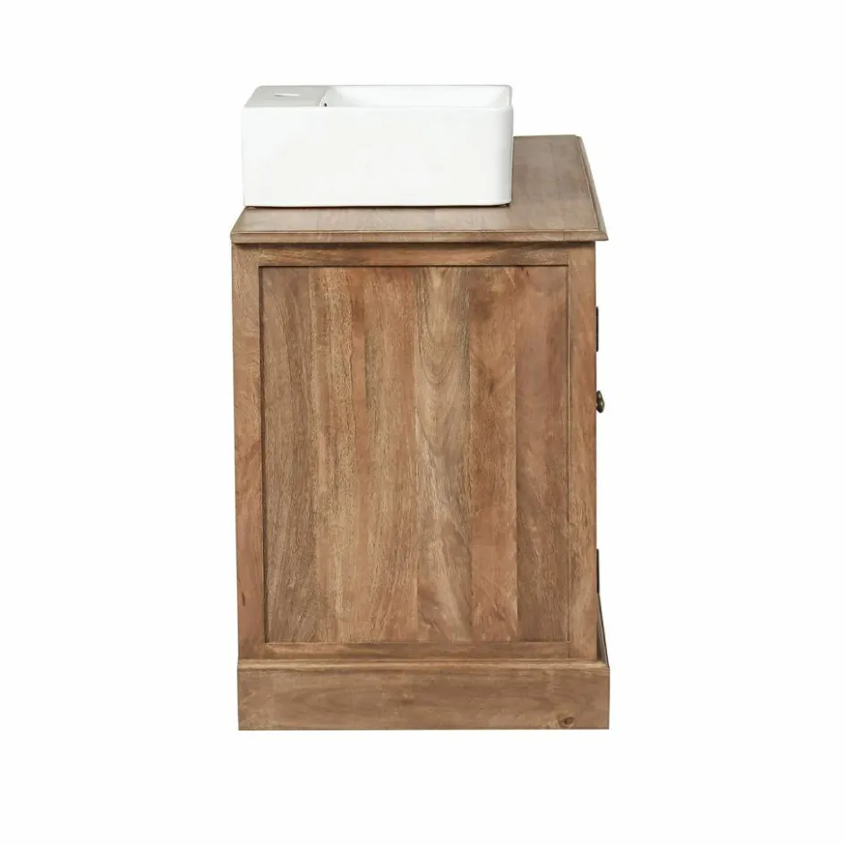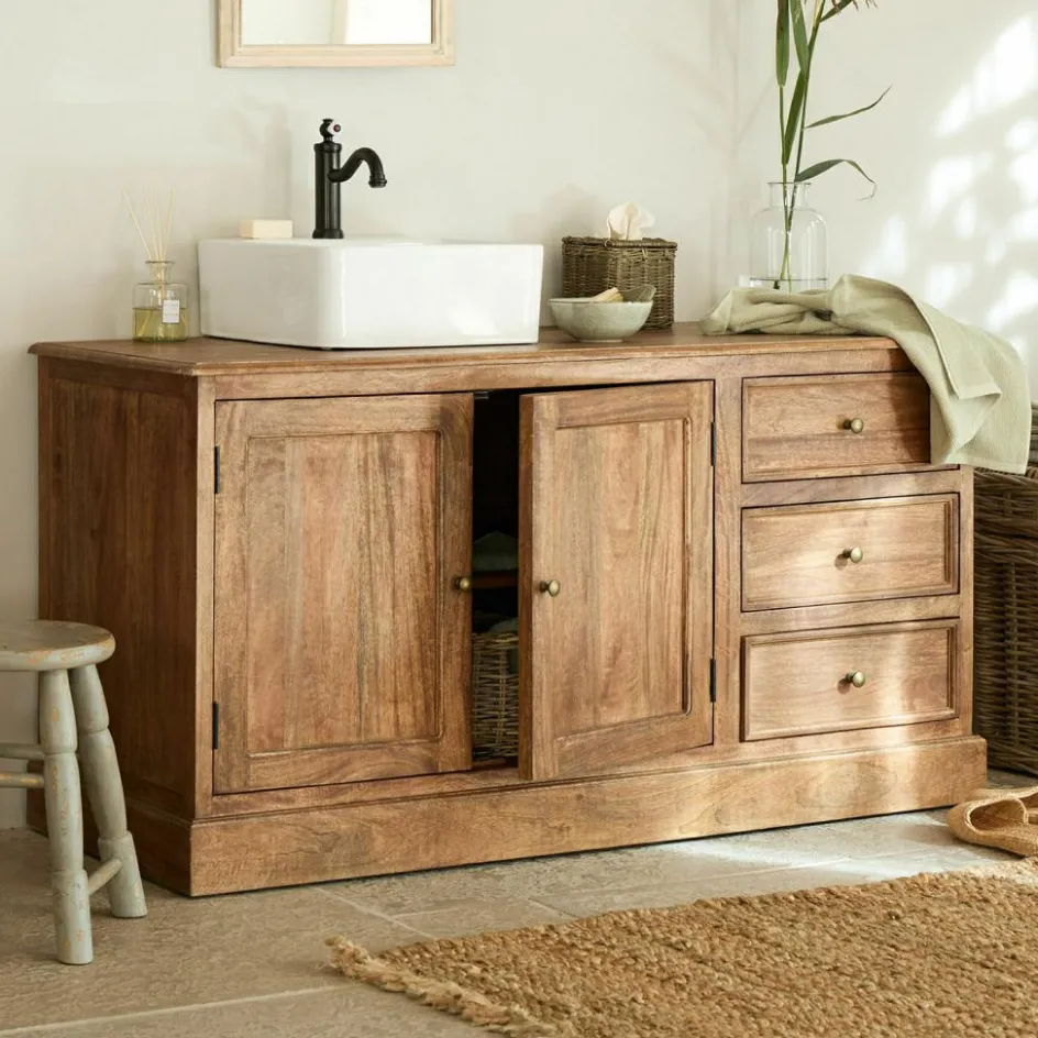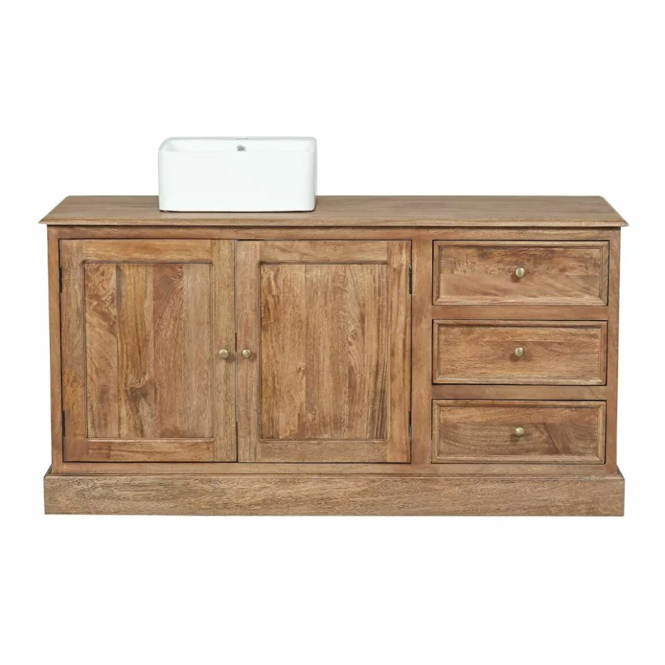Manchmal begegnet man einem solchen Waschtisch in französischen Landhotels, in denen die Zeit stillzustehen scheint und die Möbel seit eh und je einen festen Platz im Interieur haben. Für Sie aber könnte es die Gelegenheit sein, mit diesem Waschtisch eine neue Atmosphäre in Ihr Badezimmer zu bringen, das vielleicht – wie in vielen Häusern – bisher nur dem Anspruch der Funktionalität genügt. Mit dem dunklen Holz, der klassischen Kassettenverzierung und dem massiven Sockel wird sofort das typisch anheimelnde Landhaus-Feeling bei Ihnen einziehen und aus Ihrem Badezimmer eine stilvolle Entspannungs- und Wellness-Oase machen. Doch so traditionell sich der Waschtisch auf der einen Seite gibt, so trendy ist auf der anderen Seite das kantige Aufsatzbecken aus moderner Keramik. In den drei geräumigen Schubladen verschwinden Handtücher, Creme, Shampoo, Haartrockner und vieles mehr, so dass Ihr Badezimmer immer angenehm aufgeräumt ist.