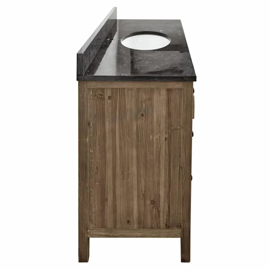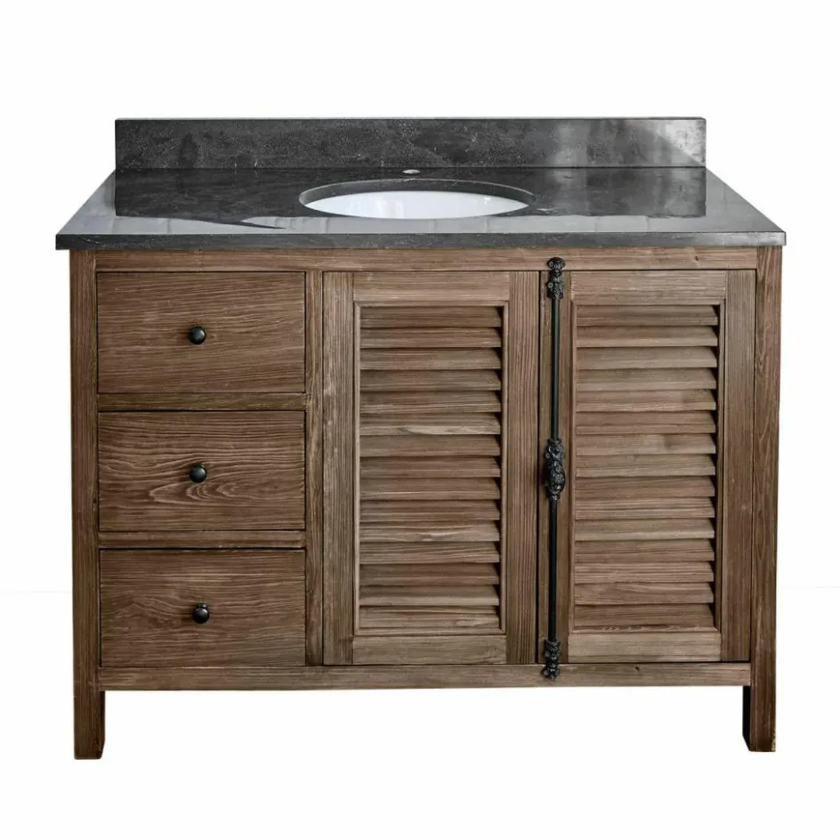 Ein Waschtisch, der mit Charakter und Natürlichkeit überzeugt. Die massive Blausteinplatte bildet einen stilvollen Kontrast zum warmen, wiederaufbereiteten Holz, dessen natürliche Maserung besonders gut zur Geltung kommt. Das eingelassene Keramik-Waschbecken fügt sich harmonisch in das Design ein und sorgt für eine klassische, zeitlose Optik. Drei Schubladen und zwei Türen mit Lamellenfront bieten großzügigen Stauraum und unterstreichen die gelungene Mischung aus Funktionalität und Ästhetik. Ob in einem modernen oder ländlichen Badezimmer – dieses Möbelstück setzt ein stilvolles Statement und bringt natürliche Eleganz in den Raum.