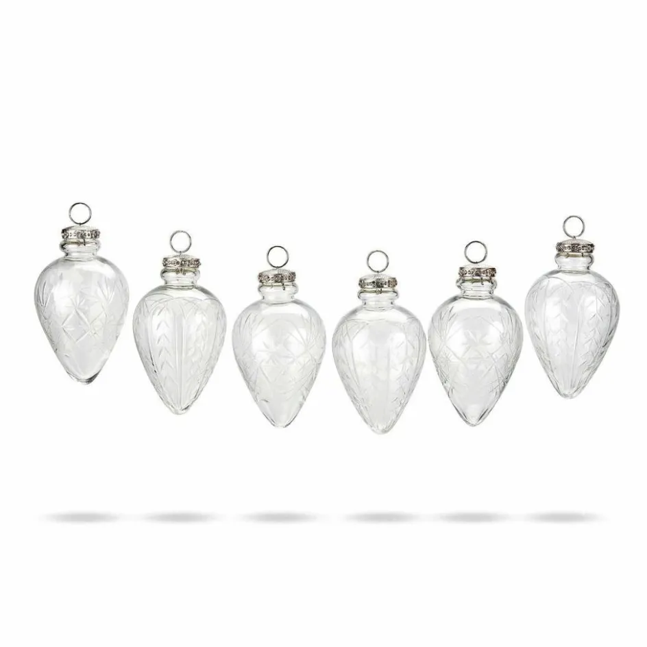 Sechs zarte Kunstwerke aus klarem Glas, das feine Sternen- und Rankenschliffe zieren. Die Aufhängung wird von kleinen Glitzersteinchen geschmückt. Die Form erinnert an Winterzapfen, die aus einem verschneiten Wald stammen könnten. Sie haben einen feinen nostalgischen Charakter und wirken ein wenig wie aus früheren Jahrhunderten. Einfach zeitlos elegant. Sie passen sich den verschiedensten Dekorationen an: ob klassisch und festlich mit Rot- und Goldtönen, poppig bunt mit Glitzer, rustikal im Country-Stil, skandinavisch oder in Eistönen wie Weiß und Silber. Echte Multitalente, die alle Jahre wieder die Tanne schmücken könnten.
