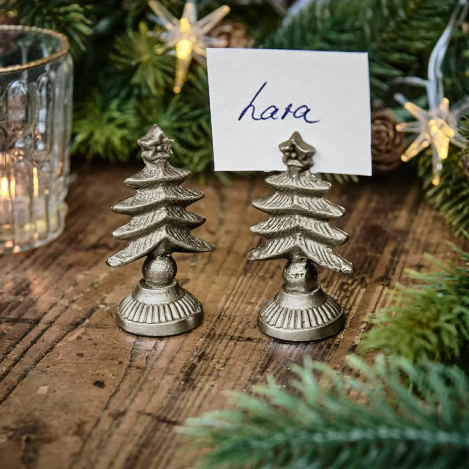 Wenn der Tisch gedeckt ist und Kerzenschein die Gläser zum Funkeln bringt, darf ein liebevolles Detail nicht fehlen: Diese beiden Kartenhalter im Tannenbaum-Design verleihen Ihrer Dekoration das gewisse Etwas. Gefertigt aus schwerem Aluguss und mit einem matten Antiksilber-Finish versehen, wirken sie wie kleine Skulpturen im Miniaturformat. Die Baumspitze ist so gestaltet, dass dort eine Karte sicher eingeklemmt werden kann – sei es mit einem Namen, einem Wunsch oder einem festlichen Gruß. Ein festliches Highlight für die Weihnachtstafel, das garantiert ins Auge fällt.