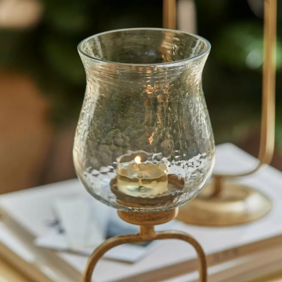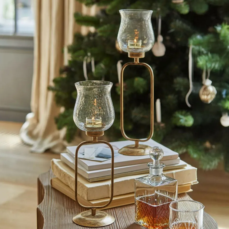 Zwei Windlichter, die nicht einfach nur leuchten – sie erzählen eine Geschichte von Kontrast und Balance. Das sanft gewellte Glas bricht das Kerzenlicht in weichen Reflexen und lässt jeden Raum in ein lebendiges Spiel aus Licht und Schatten tauchen. Der filigrane Rahmen aus Eisen bildet dazu einen stabilen Gegenpol – mit seinem antik anmutenden Finish wirkt er wie aus der Zeit gefallen. Ob auf der Fensterbank, dem Kaminsims oder als Mittelpunkt auf dem Tisch: Dieses Duo zieht alle Blicke auf sich, ohne laut zu sein. Ein stilvolles Statement für warme Stunden und ruhige Momente.