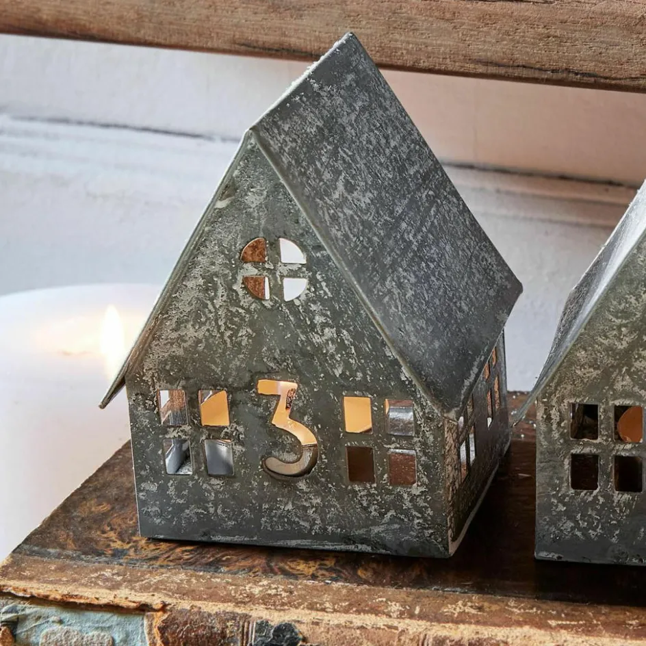 Nicht rund, nicht aus Tannengrün – und genau deshalb so besonders: Diese vier charmanten Metallhäuschen lassen sich wunderbar als Adventskranz inszenieren. Mit ihren nummerierten Fassaden und liebevoll ausgeschnittenen Fensterdetails erzählen sie leise von verschneiten Gassen, Kerzenschein und Vorfreude auf Weihnachten. Die silbrig verwitterte Oberfläche im Shabby-Finish verleiht jedem einzelnen Häuschen einen Hauch von Zeitreise – als hätte man sie in einer alten Truhe auf dem Dachboden entdeckt. Stellen Sie ein Teelicht hinein und beobachten Sie, wie durch die kleinen Öffnungen ein sanftes Lichtspiel auf dem Tisch tanzt – für einen Advent voller Atmosphäre und Wärme.