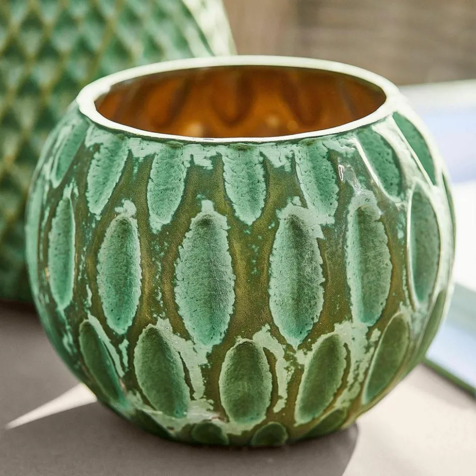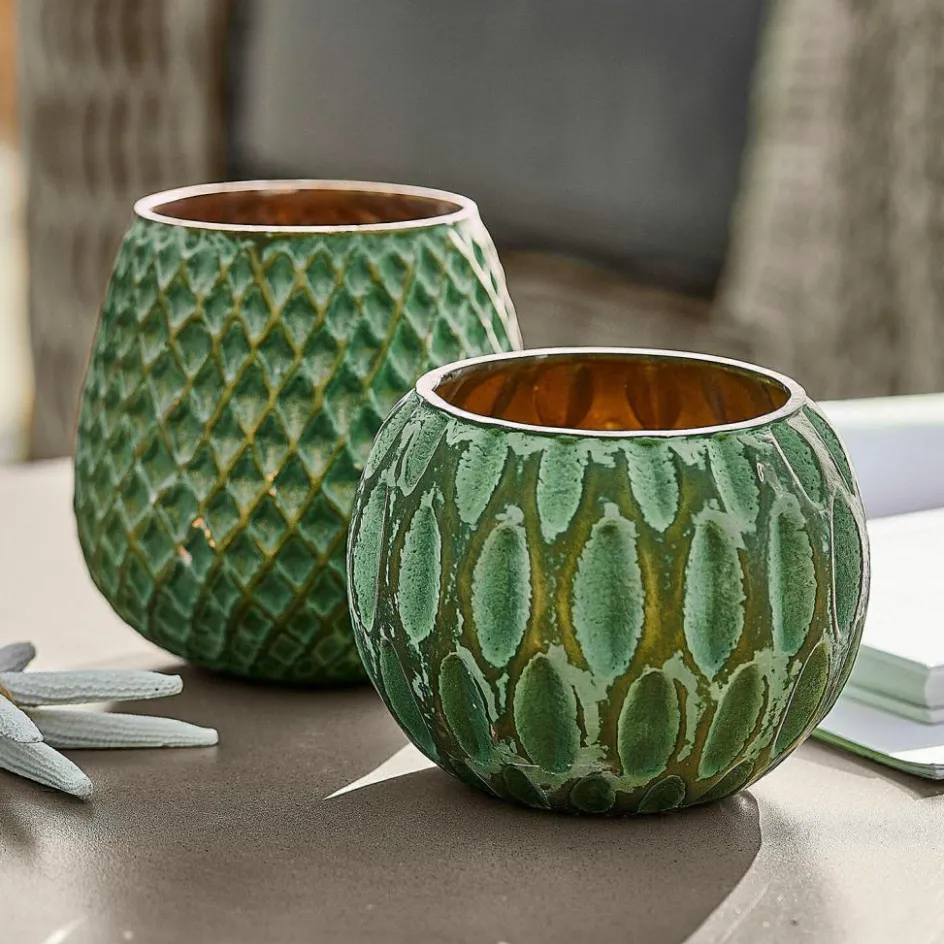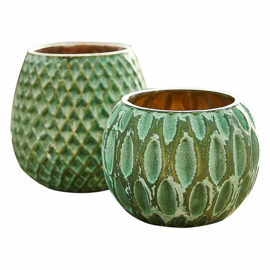 Mit diesem Windlicht-Set holen Sie sich ein Stück kunstvolle Handwerkskunst nach Hause. Jedes Windlicht ist handgefertigt und verzaubert durch die harmonische Verbindung von sattem Grün und goldenem Innenleben. Die strukturierte Oberfläche erinnert an organische Formen und lässt das Kerzenlicht sanft durchschimmern, wodurch ein bezaubernder Lichteffekt entsteht. Perfekt für stimmungsvolle Abende im Wohnzimmer oder als Highlight auf dem Balkon – diese Windlichter verleihen jedem Raum eine besondere Wärme und schaffen ein Ambiente voller Gemütlichkeit.