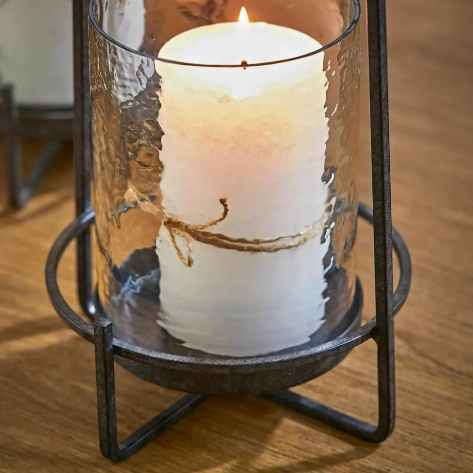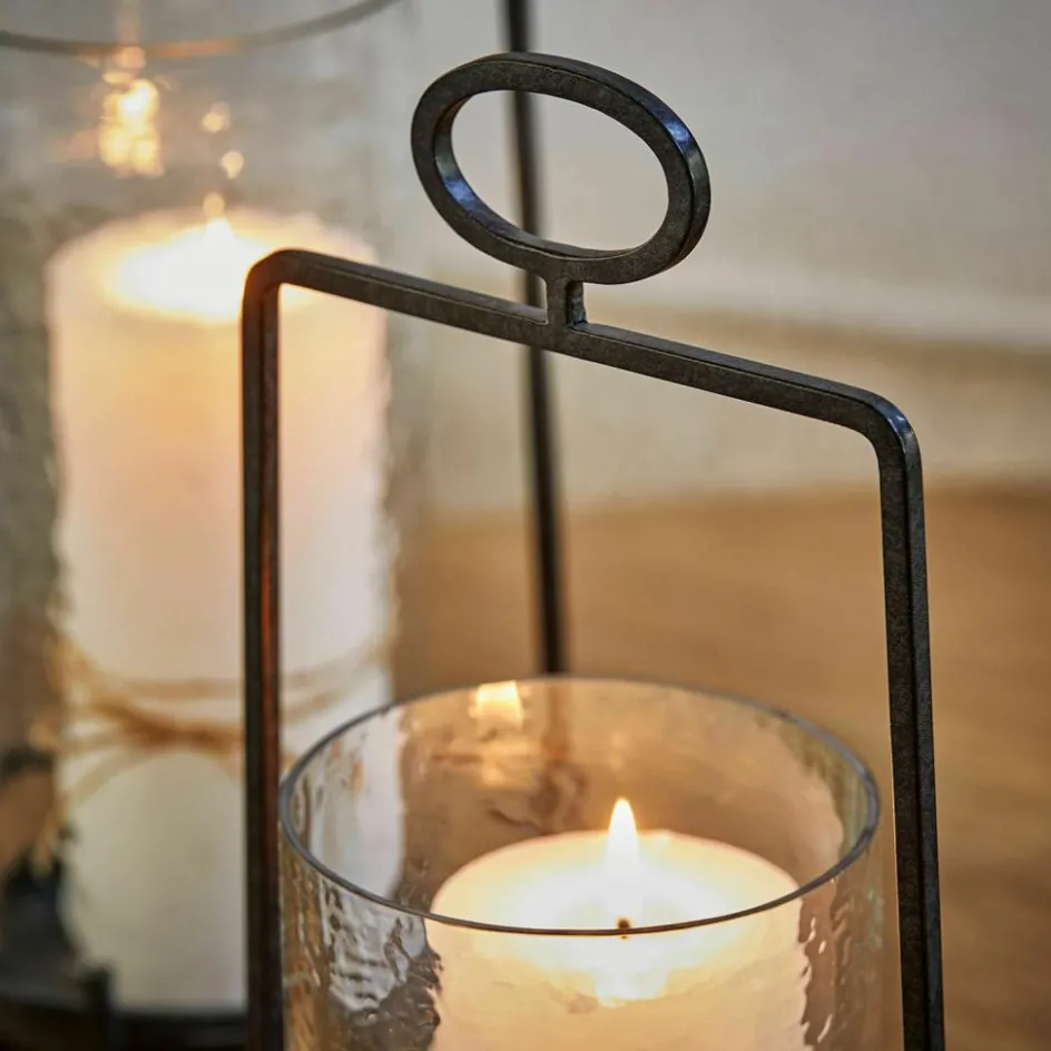 Dieses Windlicht-Duo ist wie gemacht für stille Momente und warme Akzente. Die klaren Zylinder aus mundgeblasenem Glas zeigen eine feine Wellenstruktur, die das Licht auf poetische Weise bricht – wie Spiegelungen auf einer ruhigen Wasseroberfläche. Eingebettet in einen offenen Rahmen aus mattschwarzem Eisen, entsteht ein spannender Kontrast aus Transparenz und Struktur. Durch die abnehmbaren Glaseinsätze lässt sich das Set ganz leicht reinigen und flexibel dekorieren – ob mit Kerzen, kleinen Lichterketten oder Naturmaterialien. Zwei Größen, ein Blickfang: Diese Windlichter schaffen ein stimmungsvolles Lichtspiel mit architektonischem Charakter.