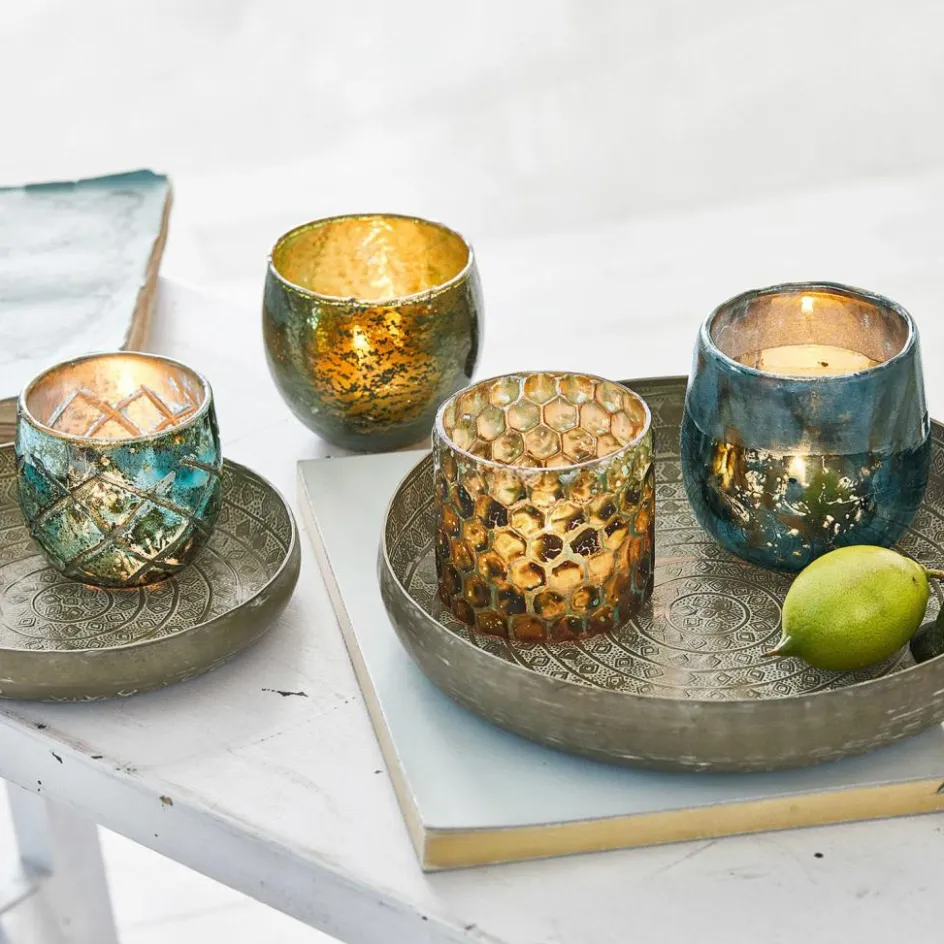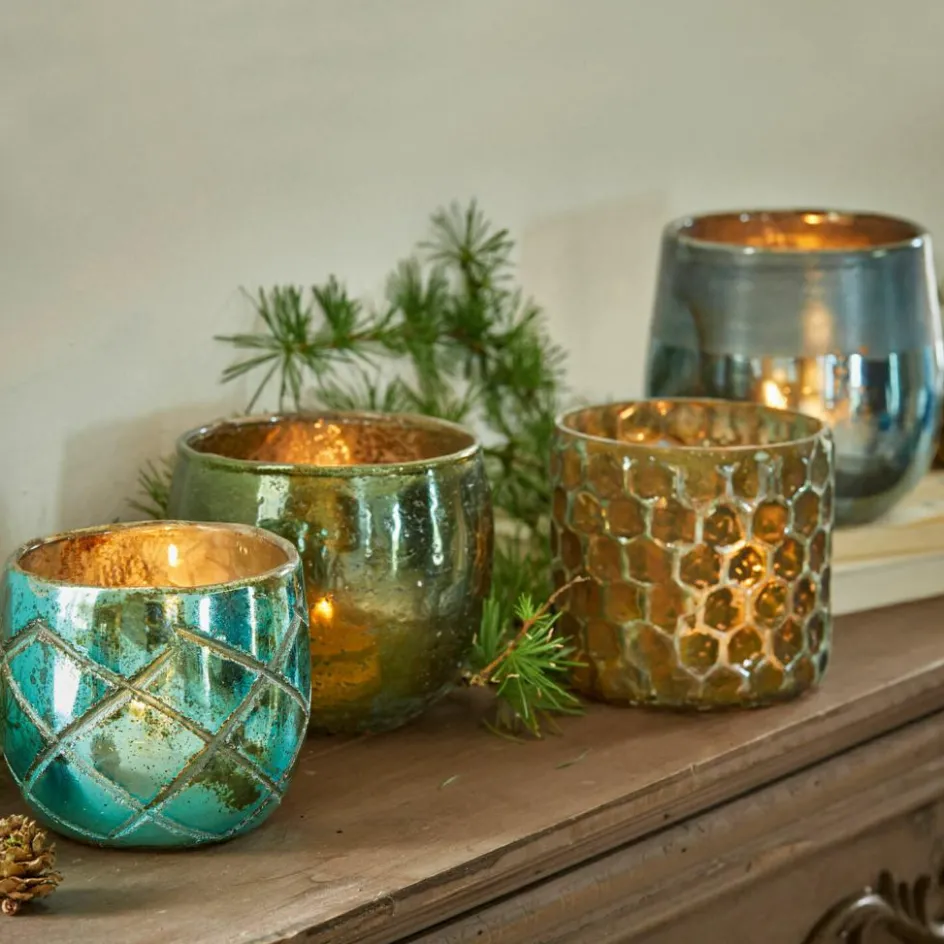 Die Schmuckstücke in der grünlich irisierenden Farbpalette sind ein absoluter Blickfang. Das Set besteht aus vier Glas-Windlichtern, doch jedes von ihnen ist einzigartig. Die Gläser zeigen sich in spektakulären Farbnuancen mit Unikat-Charakter. Wobei sich auch das Oberflächen-Design auffallend unterscheidet. Handwerklich gekonnt zeigen sich hier verschiedene Gravur-Techniken, wie etwa der Waben- und der Rautenschliff. Zudem sind die faszinierenden Farbtöne sowohl glänzend als auch matt aufgebracht. Dadurch entstehen ebenfalls faszinierende Kontraste in der Gesamt-Optik. Wobei der versilberte Untergrund zusätzlich reizvolle Kontraste schafft. Die eleganten Windlichter aus Glas sind stimmungsvolle Deko-Accessoires. Mit klassischen Teelichten hell erleuchtet, zaubern sie eine feine Stimmung. Und sollten Sie einmal keine Teelichte bei der Hand haben – kein Problem. Die irisierenden Glasfarben funkeln Ihnen in jedem Fall entgegen.