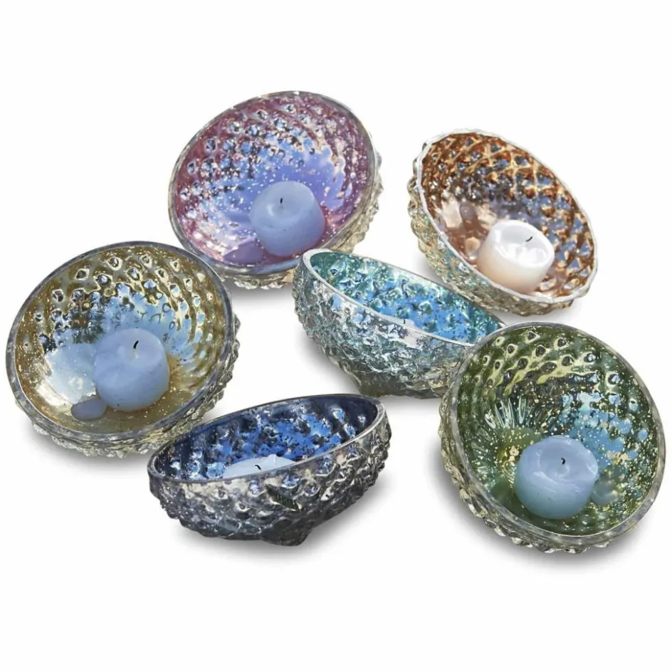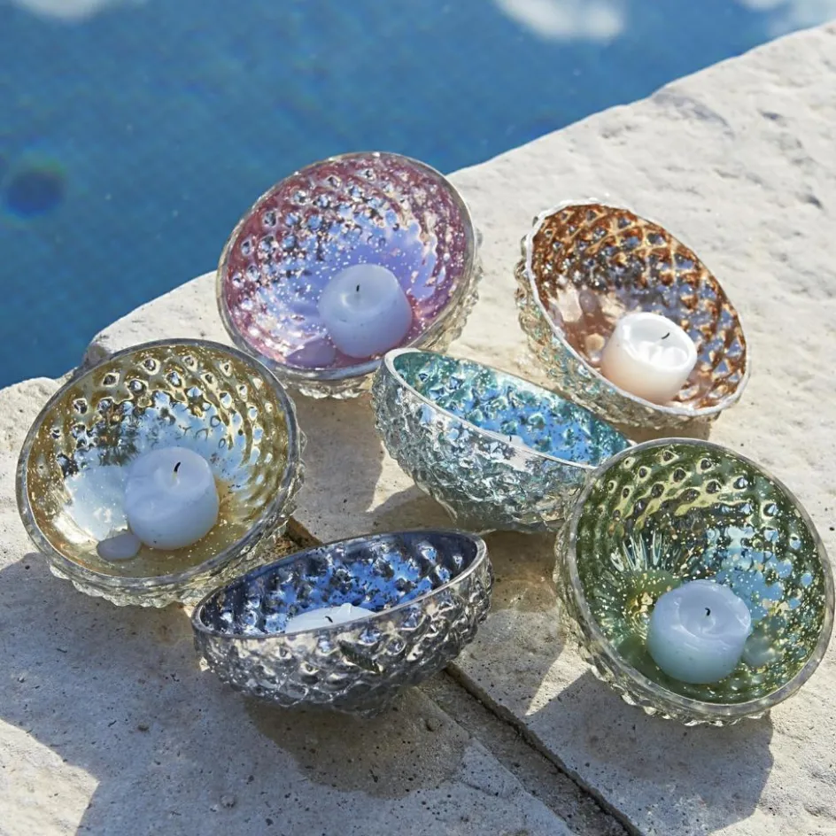 Kleine Wasserflächen bieten Dekorationsfläche, die Sie auf Ihren Gartenpartys für den stilvollen Blickfang nutzen können. Natürlich sind schwimmende Blütenblätter und Kerzen im Pool nett. Wenn jedoch das Wachs der Kerzen heruntergebrannt ist und Blätter auf den Boden sinken macht es keinen Spaß, sie wieder herauszufischen. Diese Schwimmlichter aus buntem, durchscheinendem Glas bieten die ideale Lösung um Farbe auf ihre offenen Wasseroberflächen zu bringen. Die 6 fast handgroßen, farbigen Schwimmlichter können mit großen oder kleinen Teelichtern bestückt werden. Durch Ihr schalenförmiges Glas schwimmen diese Lichtinseln leicht auf dem Wasser und spiegeln ihre Farben auf der Wasseroberfläche. Durch das sehr klassische Rautenmuster wir das Licht der Kerze in vielen aufregenden Facetten auf das Wasser gespiegelt. In der Mitte sind die Schwimmlichter etwas dickwandiger gearbeitet. Dieses Detail sorgt dafür, dass ihr Gewicht zentriert wird, während sie langsam über das Wasser treiben. Leicht auf der Wasseroberfläche treibend wie eine Feder und farbenfroh wie ein Regenbogen. Diese Schwimmlichter aus Glas verbreiten eine romantische Kerzenstimmung.