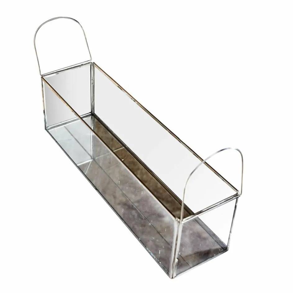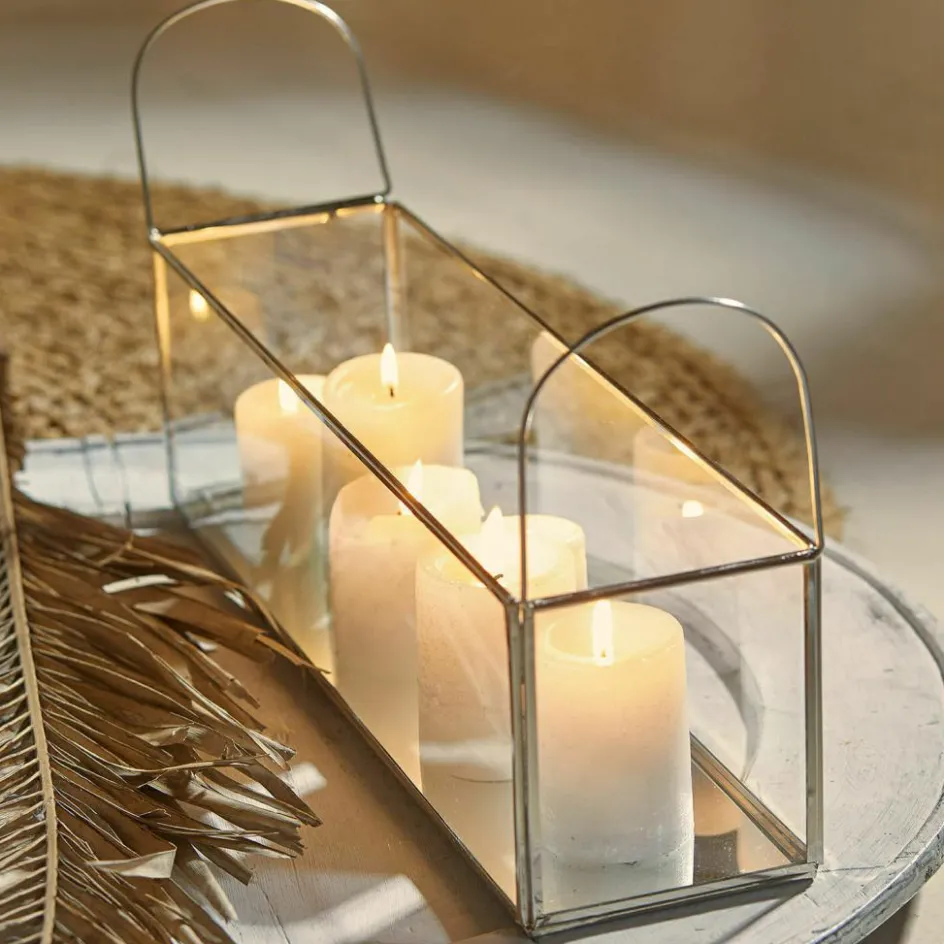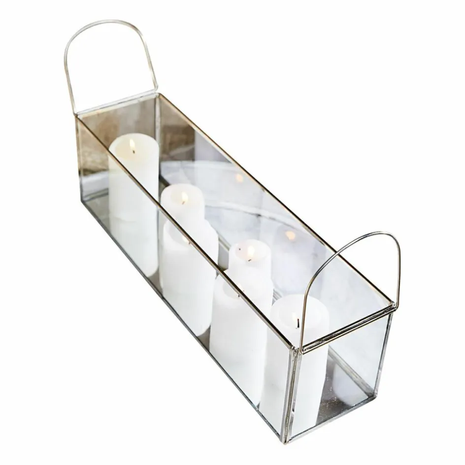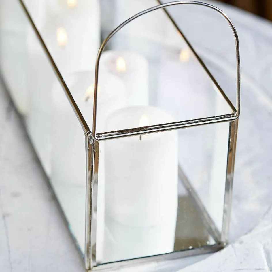 Dieses großzügige Windlicht ist ein stilvolles Highlight, welches gemütlichen Kerzenschein in jedes Ambiente zaubert. Durch den Spiegelboden wird dieser Effekt noch verstärkt. Das Windlicht hat ein filigranes, vernickeltes Gestell aus Edelstahl, Einsätze aus Glas und einen Boden aus Spiegelglas, welcher für eine raffinierte Optik sorgt. Pur oder individuell dekoriert bringt das Accessoire besonderen Charme zu Ihnen. Genießen Sie romantische Abende bei Kerzenschein am Esstisch mit einem köstlichen Dinner, im Garten oder auf dem Balkon. Sie könnten um die Kerzen herum schöne, am Meer gesammelte Steine oder Muscheln dekorieren, oder das gläserne Gestell auch komplett mit Dekoration füllen, ohne Kerzen darin anzuzünden. Eine Lichterkette, ein Blütenpotpourri, Trockenblumen und andere Fundstücke lassen sich auf Wunsch wunderbar darin anrichten und immer wieder neu arrangieren. Das schicke Accessoire schmeichelt allen Interieurs.